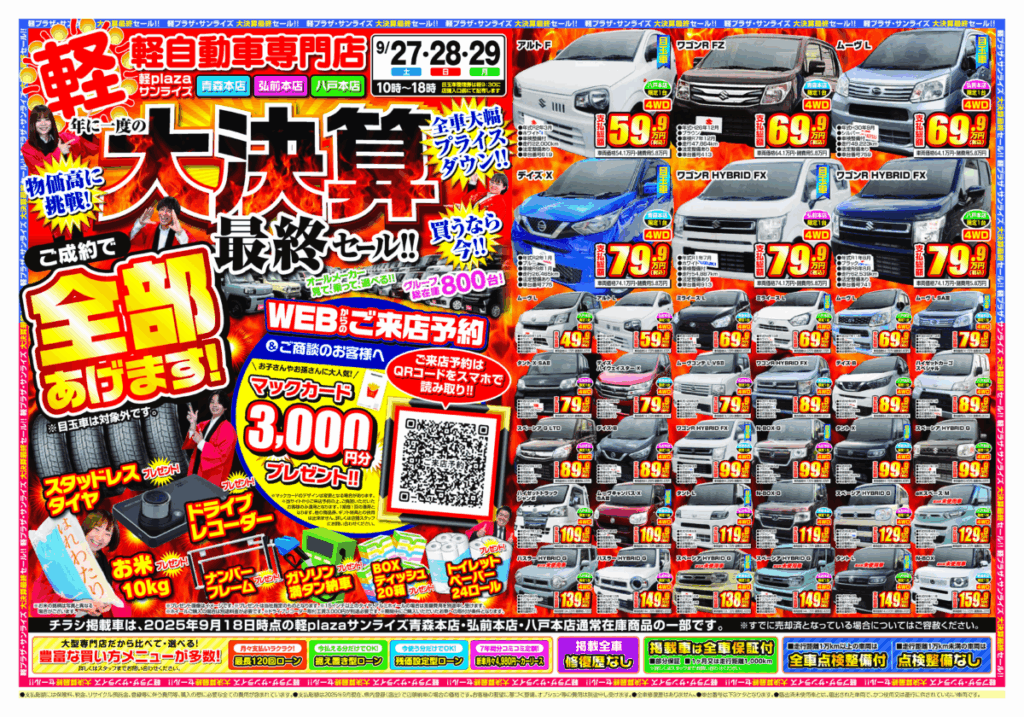 軽プラザサンライズでは9月27日(土)~9月29日(月)【大決算最終セール】を開催!