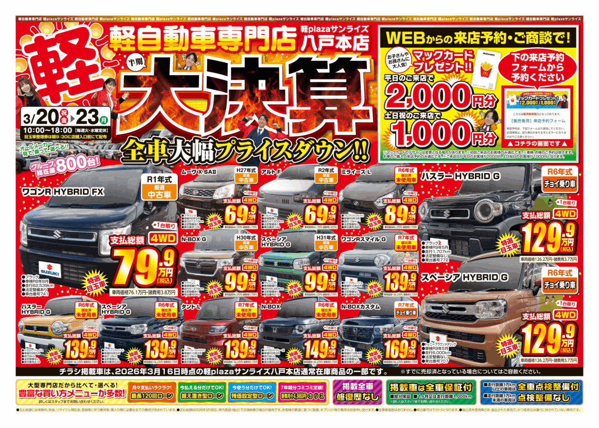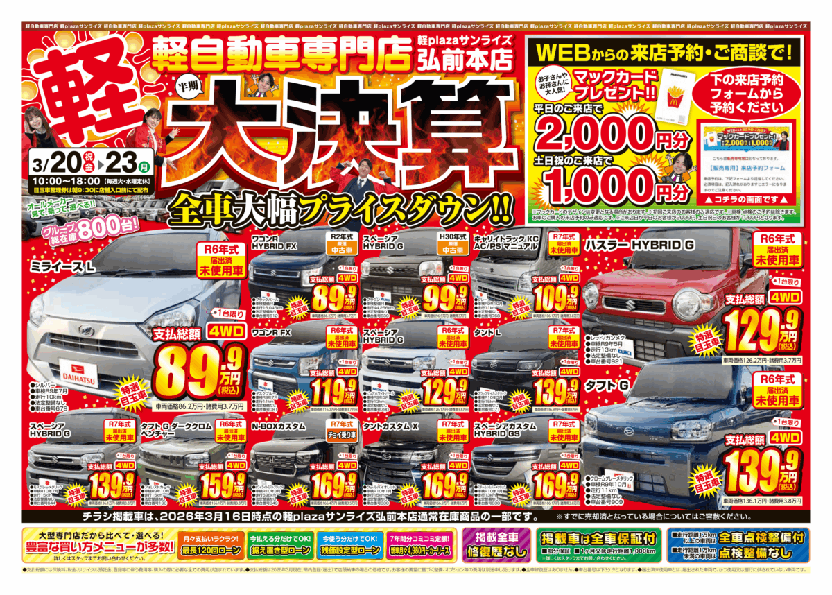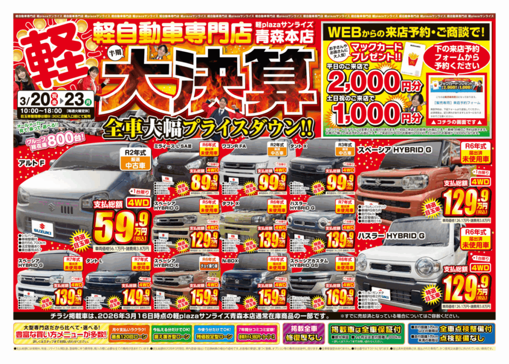 軽プラザサンライズでは、2026年4月3日(金)~ 13日(月)に全車大幅プライスダウン!!の【在庫一掃セール】を開催!