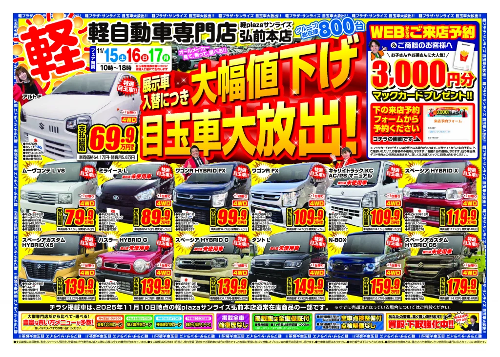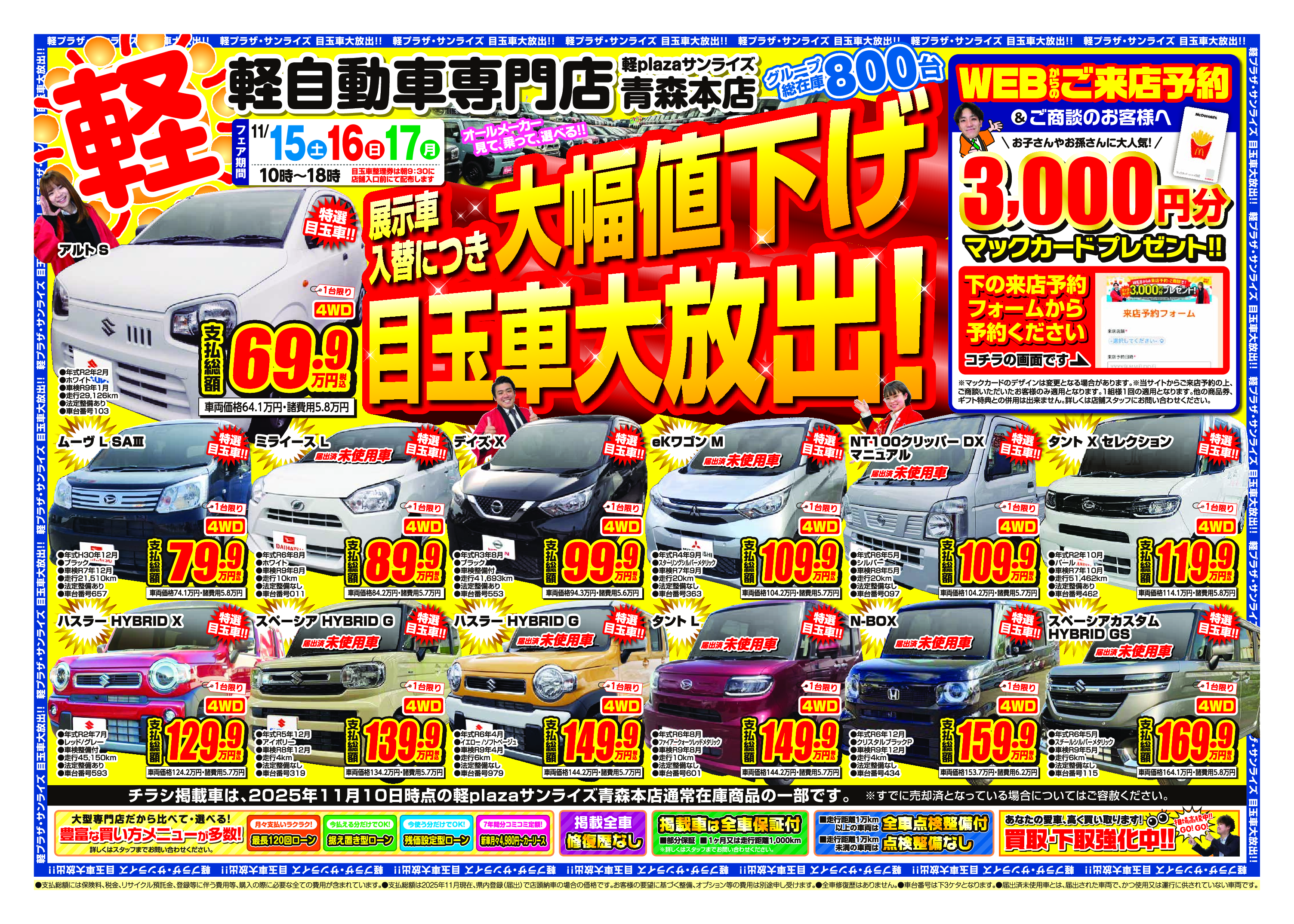 軽プラザ11月15日~11月17日【大幅値下げ!目玉車大量放出!】Webチラシ 2025年11月11日 keiplaza 新着情報 サンライズモータース, 軽プラザ 軽プラザサンライズでは11月15日(土)~11月17日(月)に【大幅値下げの目玉車】を大量放出いたします! 全車大幅プライスダウン!!お得な目玉車を多数ご用意! Web予約特典がありますので、このページをご覧いただいた方は、まずWebからの事前予約がおススメです! ■青森本店 ■弘前本店 ■八戸本店 来店予約はこちら