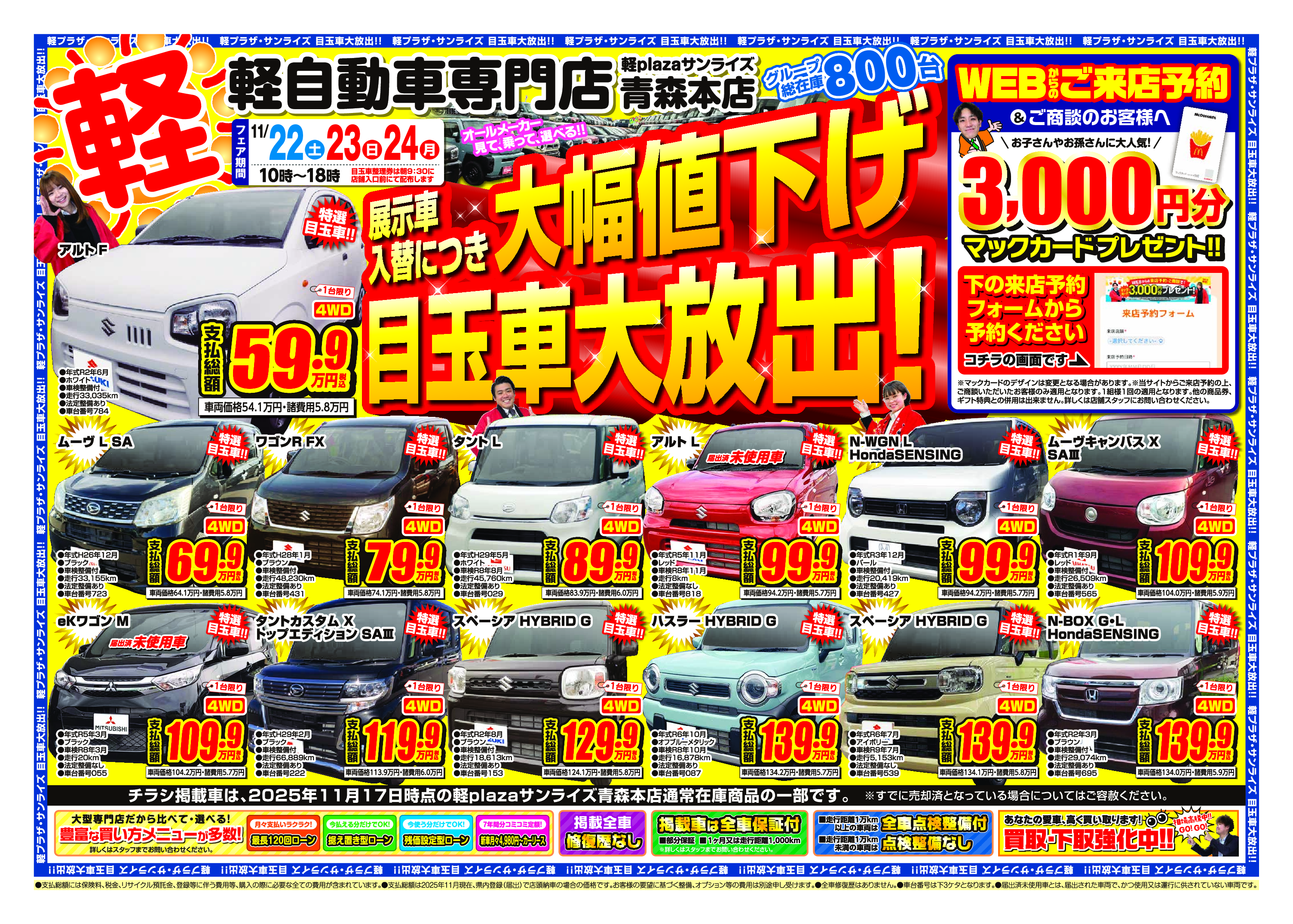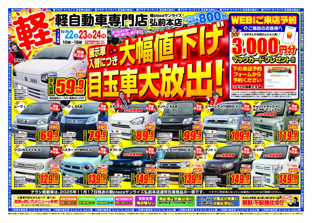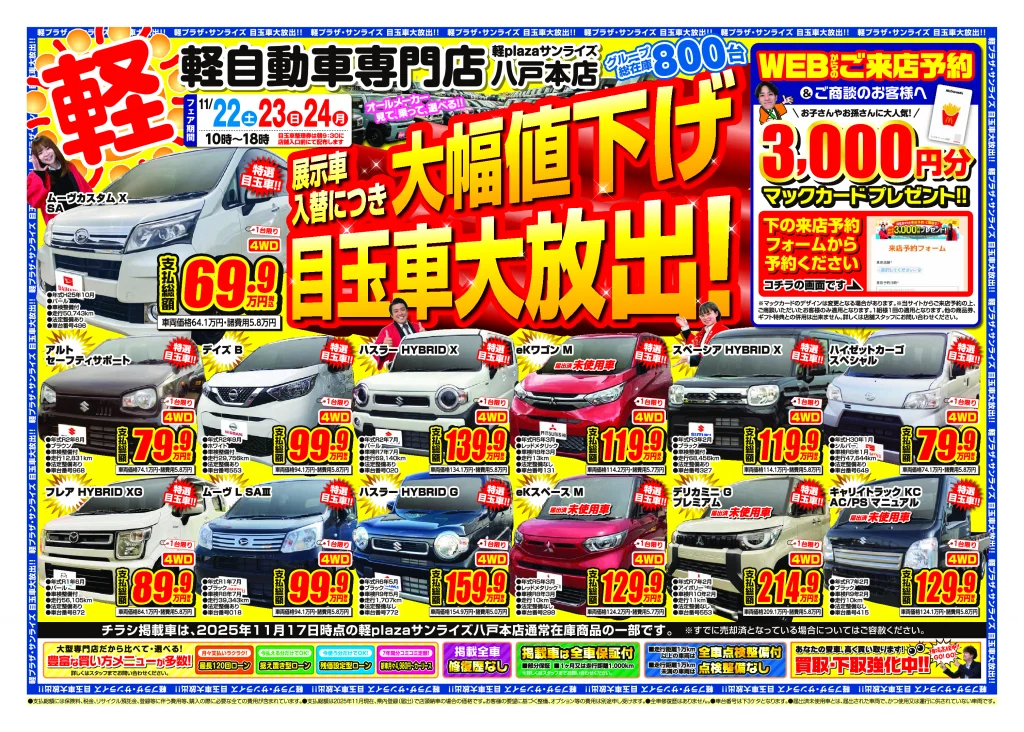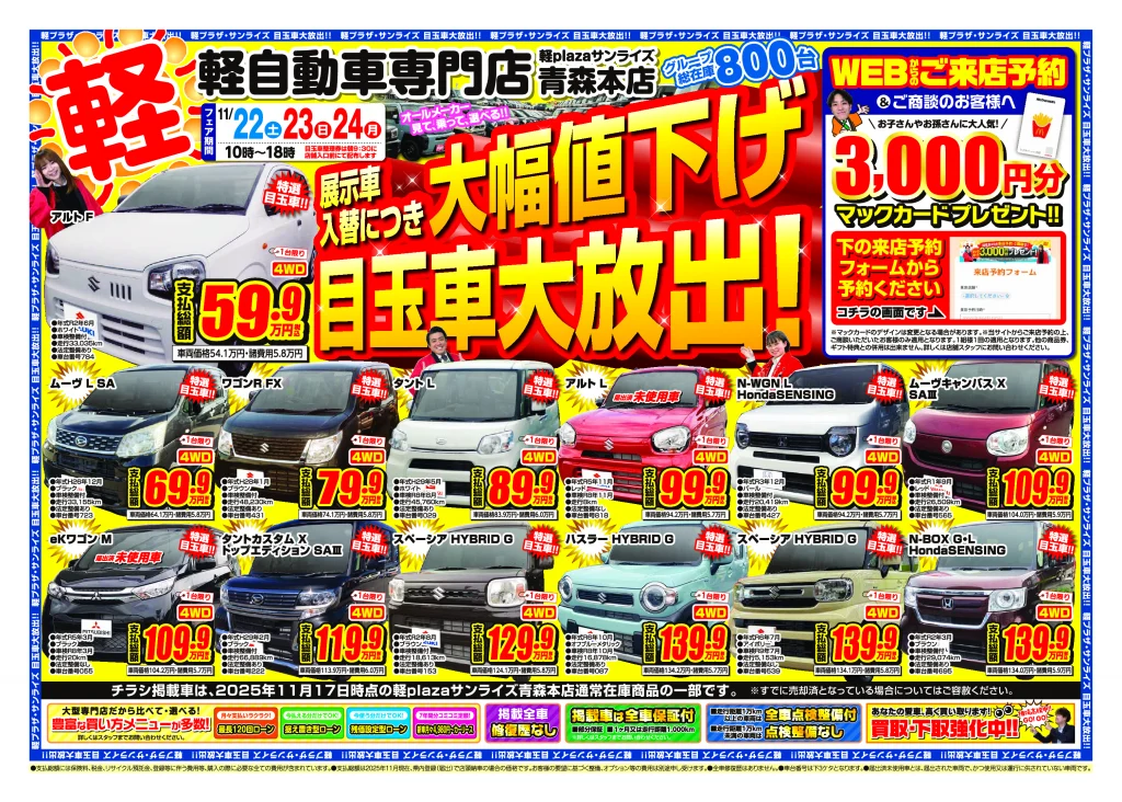 軽プラザ11月22日~11月24日【大幅値下げ!目玉車大量放出!】Webチラシ 2025年11月18日 keiplaza 新着情報 サンライズモータース, 軽プラザ 軽プラザサンライズでは11月22日(土)~11月24日(月)に【大幅値下げの目玉車】を大量放出いたします! 全車大幅プライスダウン!!お得な目玉車を多数ご用意! Web予約特典がありますので、このページをご覧いただいた方は、まずWebからの事前予約がおススメです! ■青森本店 ■弘前本店 ■八戸本店 来店予約はこちら