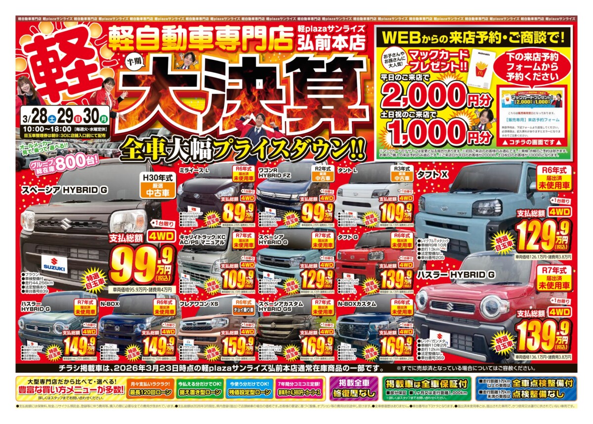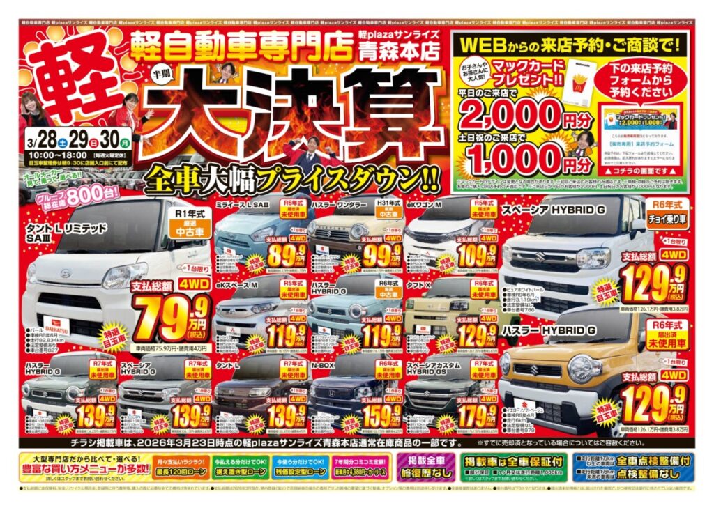 軽プラザ3月28日~30日【大決算】Webチラシ 2026年3月24日 keiplaza 新着情報 サンライズモータース, 軽プラザ 軽プラザサンライズでは、2026年3月28日(土)・29日・30日(月)に全車大幅プライスダウン!!の【大決算】をまだまだ開催! WEBからのご来店予約&ご商談でマックカードプレゼント!!限定目玉車も多数ご用意しております! このページをご覧いただいた方は、まずはWebからの事前予約がおススメです! ■青森本店 ■弘前本店 ■八戸本店 WEBチラシはこちら 来店予約はこちら